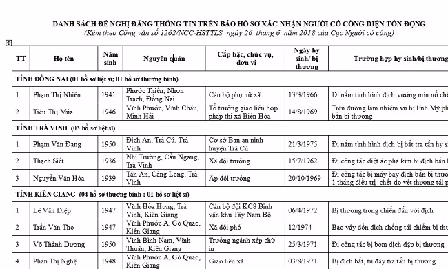 Tiếp sau danh sách hồ sơ tồn đọng đợt 2 năm 2107 (đã công bố công khai tháng 12-2017), đến nay, Bộ LĐ-TB&XH tiếp nhận và công bố danh sách thông tin 32 trường hợp hồ sơ tồn đọng đề nghị xác nhận liệt sĩ, thương binh (đợt 1 năm 2018), tại các tỉnh, thành phố: Đồng Nai, Trà Vinh, Kiên Giang, Cà Mau, Tiền Giang, Hậu Giang, Bắc Ninh, Quảng Nam, Quảng Bình và Hải Phòng, để nhân dân và cán bộ, chiến sĩ trong cả nước theo dõi, đồng thời phản ánh thông tin để Bộ LĐ-TB&XH hoàn thiện hồ sơ xác nhận người có công với cách mạng.