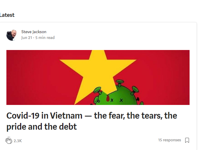 Bài viết “Covid – 19 ở Việt Nam: Nỗi sợ, nước mắt, tự hào và món nợ” của Steve Jackson thu hút hơn 2.300 lượt thích trên blog cá nhân. Một số người bạn của anh bày tỏ sự ngưỡng mộ về cuộc sống ở Việt Nam.