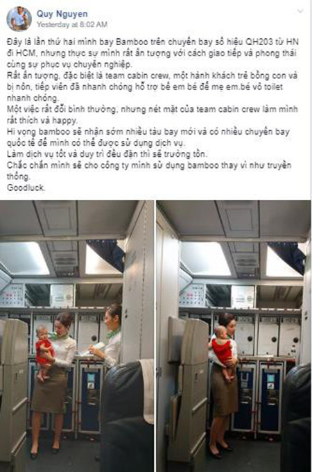 "Các cô tiếp viên của Bamboo còn thuộc sở thích của khách quen nữa đấy. Đi thích lắm. Cảm giác như thân quen nên thấy dễ chịu" – Facebook Đỗ Thị Thanh Hà cho biết.