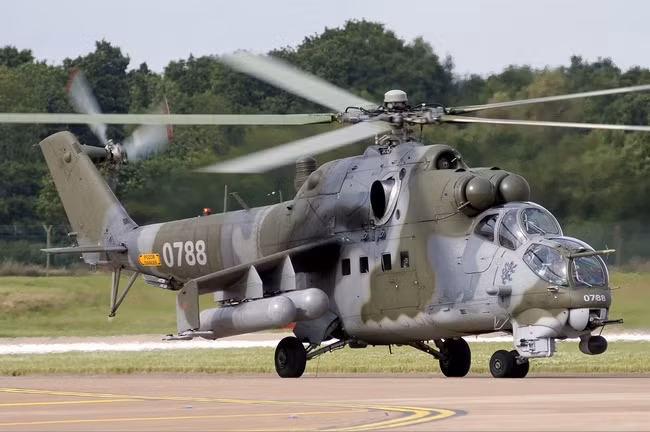 Trực thăng động cơ kép Mil-24 là một trực thăng chiến đấu có thêm khả năng vận tải. Nó có tốc độ bay tối đa 310 km/h, khả năng không vận đến 2.4 tấn và quãng đường bay liên tục 750 km, theo số liệu từ bộ quốc phòng Séc. Chiếc trực thăng được sản xuất bởi nhà máy trực thăng quân sự ở Moscow.