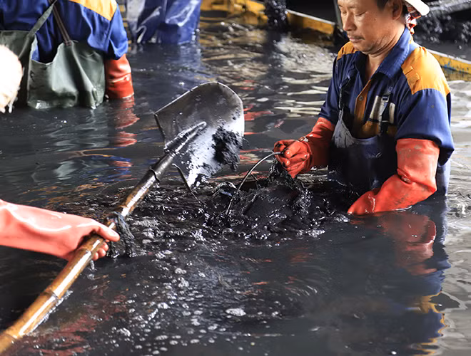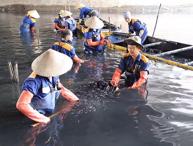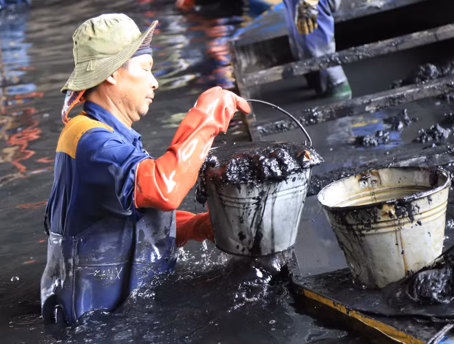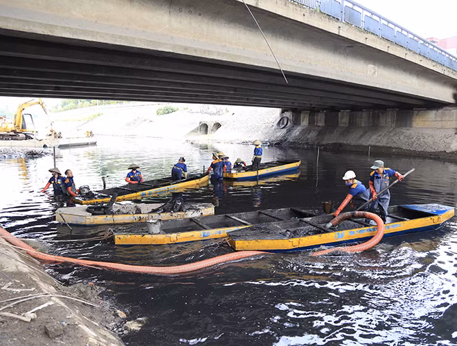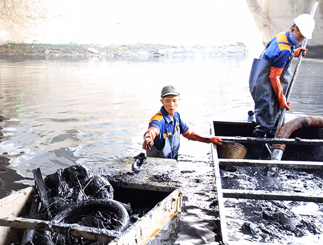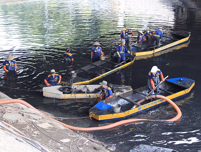 Công nhân dầm mình dưới bùn làm sạch sông Tô Lịch