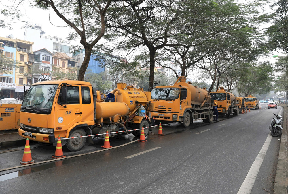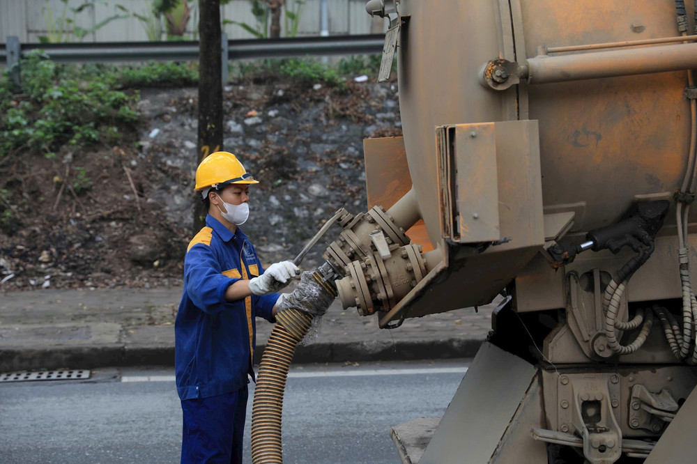 Công nhân dầm mình trong mưa rét, nạo vét bùn sông Tô Lịch