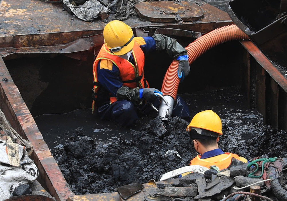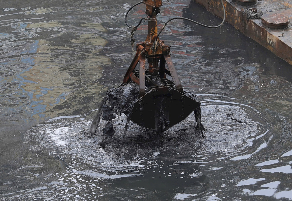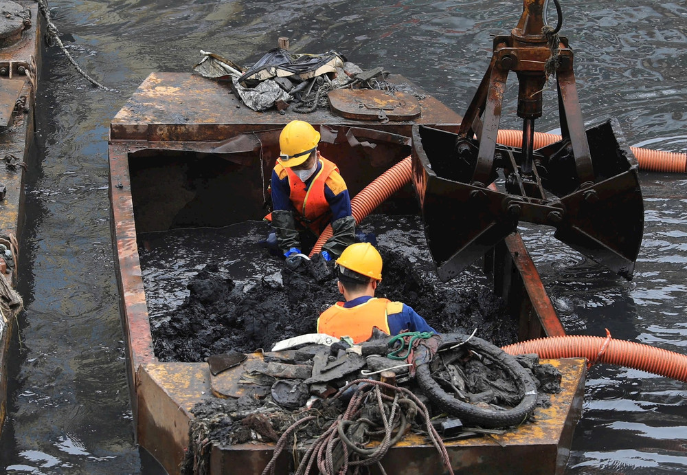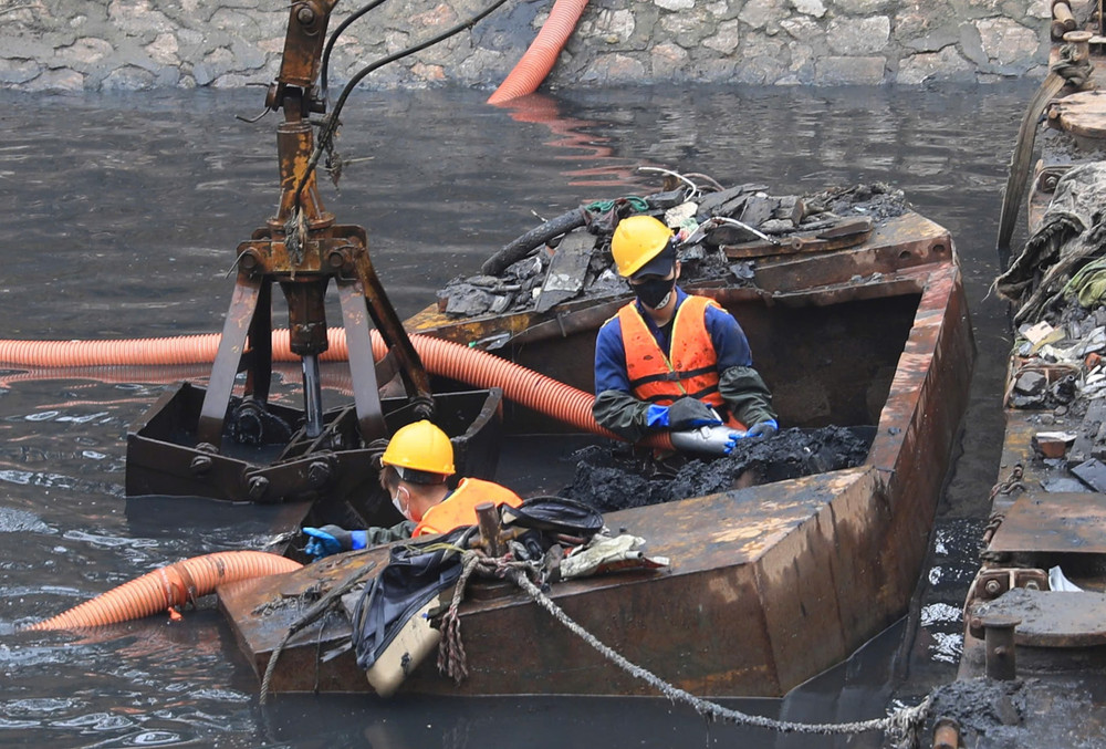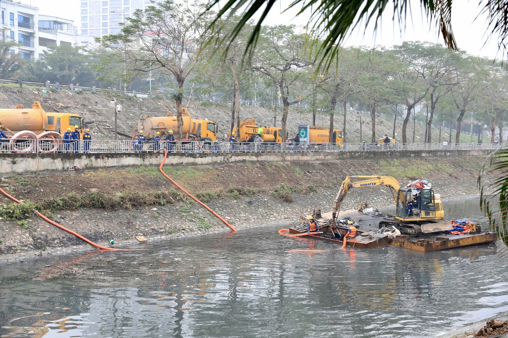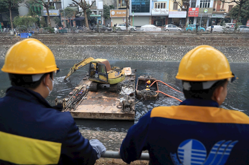 Công nhân dầm mình dưới bùn làm sạch sông Tô Lịch