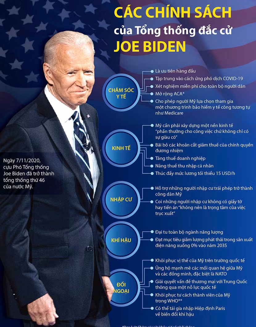 Nhận định về các chính sách của chính quyền Joe Biden sau này, một cố vấn của ông Joe Biden cho biết nhiều khả năng sẽ có sự đảo chiều các chính sách của chính quyền tiền nhiệm. Ông Joe Biden có thể rút lại sắc lệnh cấm nhập cảnh đối với một số quốc gia có đa số người Hồi giáo, đưa Mỹ trở lại Hiệp định Paris về biến đổi khí hậu cũng như hủy bỏ quyết định rút Washington khỏi Tổ chức Y tế Thế giới và bảo vệ Chương trình Hành động trì hoãn trục xuất những người nhập cư trái phép vào Mỹ từ khi còn nhỏ (DACA).