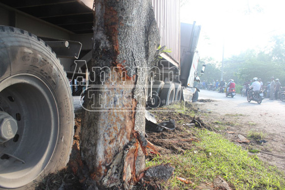 Lực tông khủng khiếp khiến chiếc xe du lịch bị bẹp rúm, chưa dừng lại, chiếc xe container tiếp tục kéo lê chiếc xe ô tô du lịch lao về phía trước, chồm lên dải phân cách và đẩy ô tô du lịch văng xuống làn đường xe máy. Chỉ khi phần rơ moóc tông vào thân cây bên đường thì chiếc xe mới chịu dừng lại.