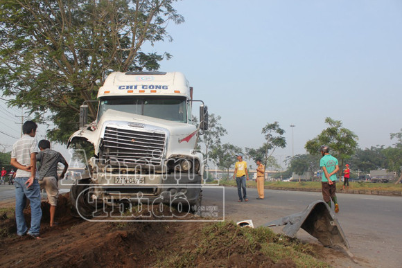 Cùng lúc này, một chiếc xe container BKS 71N-0475 của doanh nghiệp tư nhân Chí Công kéo theo rơ moóc loại 40 feet lưu thông cùng chiều với tốc độ cao, bất ngờ nổ lốp khiến chiếc xe loạng choạng mất lái tông vào đuôi xe ô tô du lịch.
