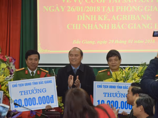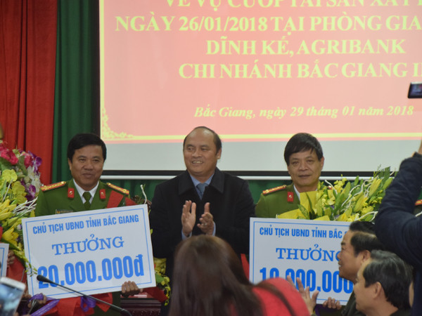 Tại buổi cung cấp thông tin với các cơ quan báo chí chiều 29-1, lãnh đạo UBND tỉnh Bắc Giang, thành phố Bắc Giang và đại diện Agribank đã trao thưởng có các đơn vị, cá nhân có thành tích khám phá nhanh vụ án, tổng số tiền là 140 triệu đồng.