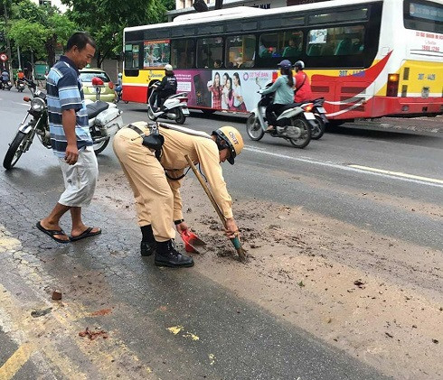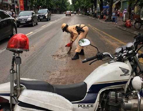 Sáng 12-7, tổ công tác CSGT Đội 1- Phòng CSGT Hà Nội gồm Thượng uý Nguyễn Khánh Thọ, Thượng uý Phạm Ngọc Anh, Trung uý Nguyễn Hoàng Long làm nhiệm vụ trên tuyến đường Hai Bà Trưng phát hiện tại trước cổng Bệnh viện Việt Nam - Cu Ba (37 Hai Bà Trưng) có 1 vệt bùn lớn, chiếm nửa làn đường.