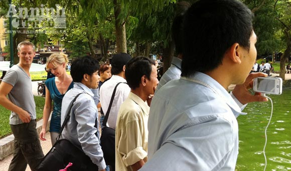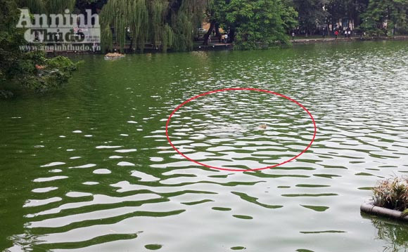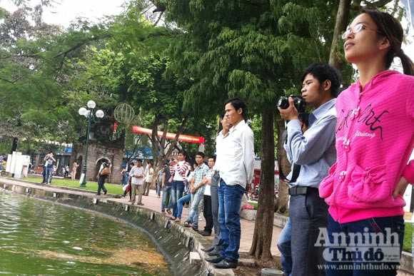 Khoảng 11h30 trưa nay (9-10), tại khu vực hồ tiếp giáp với góc ngã tư Hàng Bài- Hàng Khay (Hà Nội), cụ Rùa nổi lên phơi nắng trong tiếng hò reo của nhiều người chứng kiến.