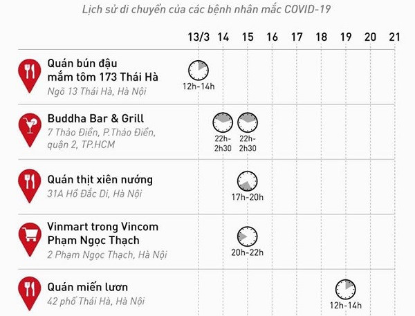Tại Quán bún đậu mắm tôm 173 Thái Hà (ngõ 173 Thái Hà), trong thời gian từ 12-14 giờ ngày 13-3 đã có bệnh nhân mắc Covid-19 đến ăn.