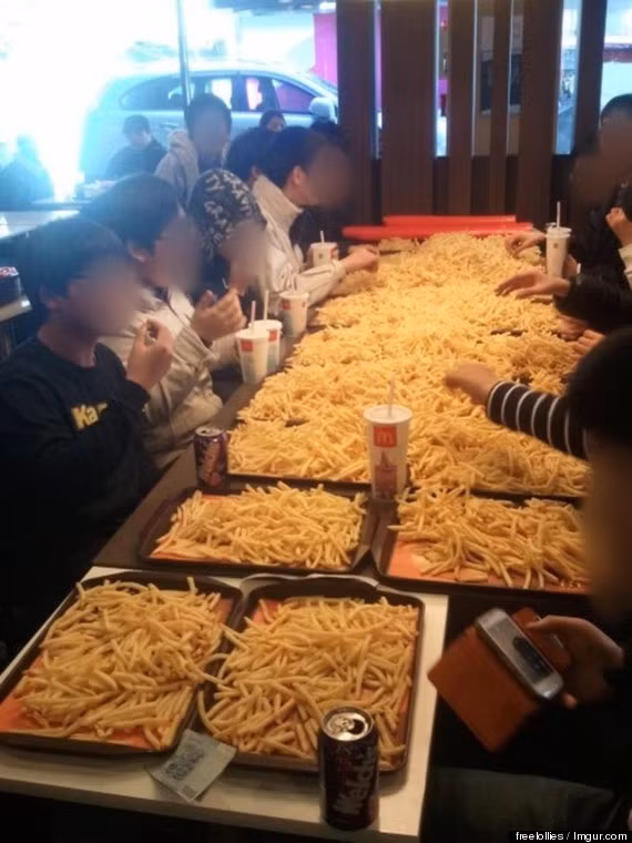 Những món thức ăn nhanh ở các cửa hàng McDonald’s luôn luôn có sức hấp dẫn lớn với trẻ em. Một cửa hàng McDonald’s ở Hàn Quốc đã đưa ra một đợt khuyến mại cực hấp dẫn mang tên “Potato Party”, giảm giá đặc biệt cho món khoai tây chiên. Đợt khuyến mại này đã thu hút một nhóm trẻ con, những đứa trẻ chi ra 250 đô-la Mỹ để mua một khối lượng khoai tây chiên khổng lồ đến mức phủ kín một dãy bàn ăn tại quán.