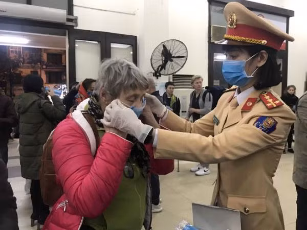 CSGT tặng và hướng dẫn du khách nước ngoài đeo khẩu trang phòng dịch tại các nhà ga, bến xe