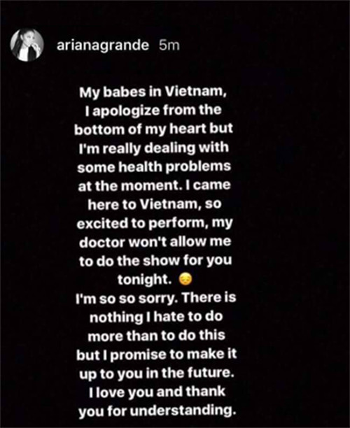 Trên trang cá nhân của mình, Ariana Grande đăng lời xin lỗi và hứa sẽ bù lại bằng một chương trình khác. Cô cũng bày tỏ mong muốn nhận được sự cảm thông của khán giả với việc cô gặp vấn đề sức khỏe và phải tuân theo chỉ dẫn của bác sĩ. Cho tới thời điểm này, Ban tổ chức cũng đã lên tiếng xác nhận, Ariana thực sự gặp vấn đề về sức khỏe, ngoài ra không có bất cứ lý do khách quan nào khác. Tuy nhiên, có một nguồn tin cho rằng, lý do show diễn này bị hủy là vì cơ quan quản lý văn hóa rút giấy phép biểu diễn do lo ngại về vấn đề trang phục.