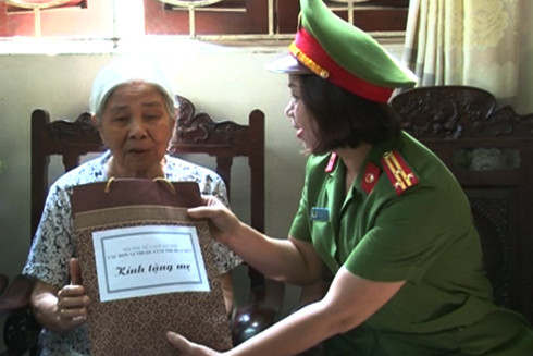 Thượng tá Nguyễn Thị Phương Đông, Phó trưởng phòng Hồ sơ cảnh sát thay mặt đoàn công tác tặng quà mẹ Nguyễn Thị Tẹo