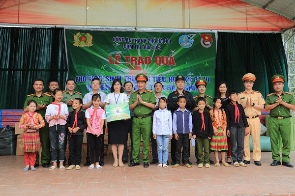 Đoàn công tác Cụm thi đua số 3 - Công an Hà Nội trang tặng quà cho học sinh Trường tiểu học Pả Vi, huyện Mèo Vạc