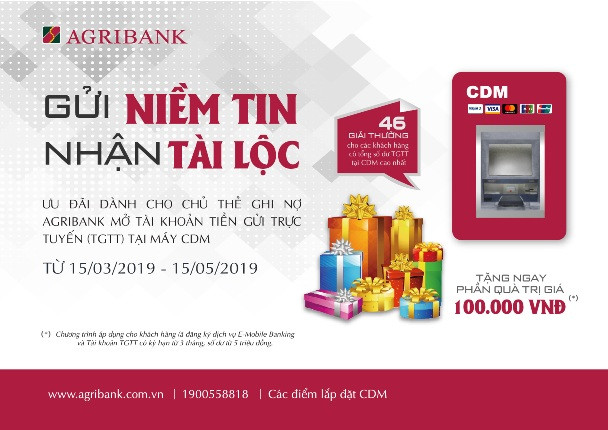 Theo đó, từ ngày 15/3/2019-15/5/2019, khách hàng là chủ thẻ ghi nợ Agribank khi mở tài khoản Tiền gửi trực tuyến (TGTT) tại máy CDM (ATM đa chức năng) sẽ nhận được hàng nghìn phần quà hấp dẫn như: