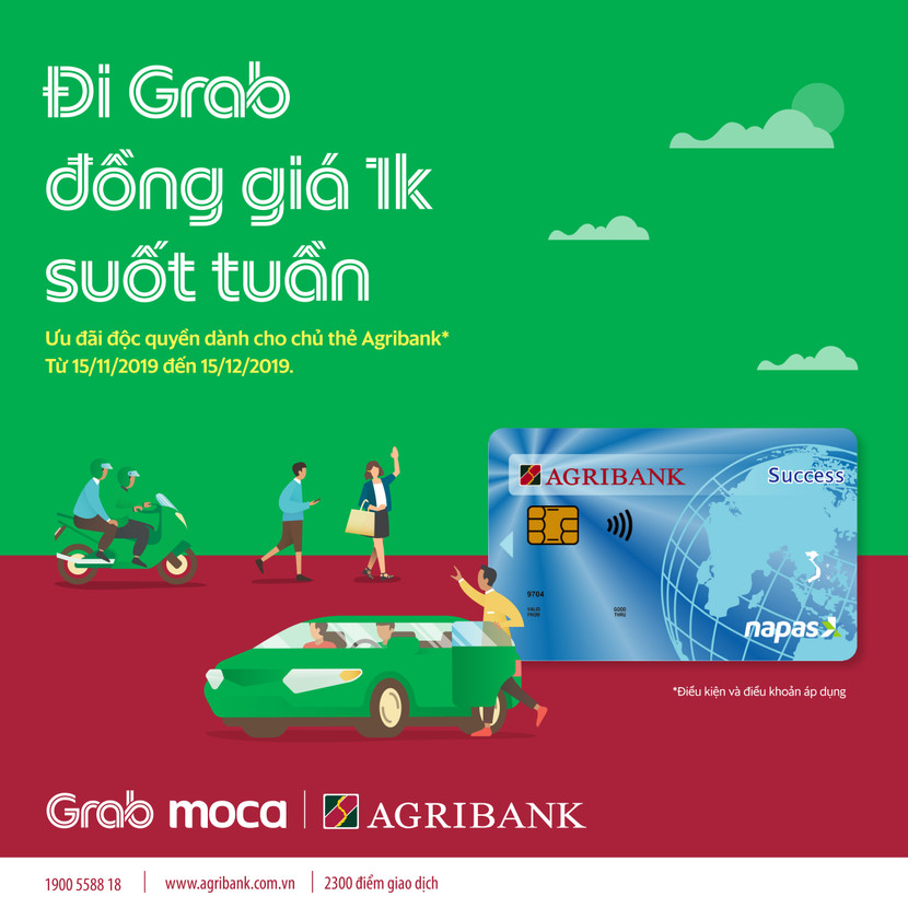 Cụ thể, từ ngày 15/11/2019 đến hết ngày 15/12/2019 khách hàng lần đầu kích hoạt Ví điện tử Moca trên ứng dụng Grab với thẻ Ghi nợ nội địa Agribank (ATM) và thực hiện ít nhất 01 giao dịch nạp tiền vào Ví từ 20.000 đồng được nhận ưu đãi sử dụng dịch vụ GrabCar/GrabBike đồng giá 1.000 đồng trong 1 tuần.