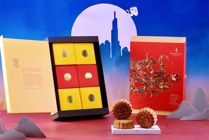 Bánh trung thu “Mãnh long cát vượng” bán tại Vinpearl Luxury Landmark 81 với 4 mẫu: An Nhiên, Phồn Hoa, Thịnh Vượng và Hoàng Kim với giá bán từ 900.000 đồng/hộp.