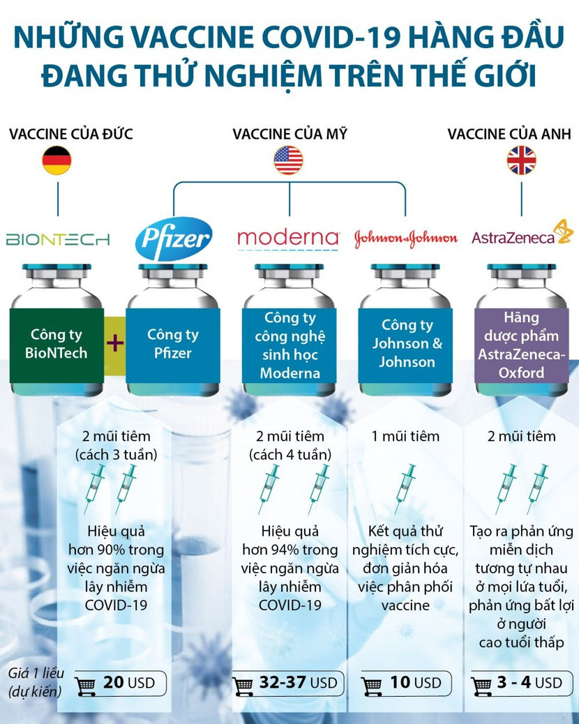 Ngày 23-11 trước đó, Hãng dược phẩm liên doanh AstraZeneca (Anh - Thụy Điển) cũng thông báo vaccine ngừa bệnh Covid-19 do hãng phát triển cùng với trường Đại học Oxford có thể đạt hiệu quả tới 90% chỉ với một liều sử dụng. Còn Hãng dược phẩm Pfizer (Mỹ) cho hay kết quả thử nghiệm cuối cùng loại vaccine ngừa Covid-19 do hãng cùng BioNTech (Đức) phát triển cho thấy hiệu quả đến 95% và không có tác dụng phụ nghiêm trọng nào. Tập đoàn Moderna (Mỹ) cho biết vaccine thử nghiệm của hãng này đã phát huy tới 94,5% hiệu quả trong việc ngăn chặn virus SARS-CoV-2 gây bệnh Covid-19.