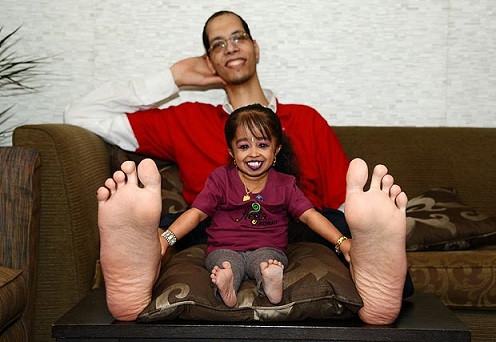 Brahim năm nay 31 tuổi. Anh là người đàn ông cao thứ nhì thế giới (2,46 m) còn cô gái Jyoti, 19 tuổi chỉ cao có 60,9 cm. Bàn chân của Brahim to tới nỗi vượt cả bảng cỡ giày thông thường.