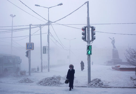 Người phụ nữ mặc kín nhất có thể để chống chọi lại cái lạnh -53 độ tại quảng trường trung tâm Yakutsk. Đây là thủ phủ thuộc nước cộng hòa Sakha, miền Viễn Đông, Nga. Nước cộng hòa này có diện tích hơn 3 triệu km2, với dân số chưa tới một triệu người.