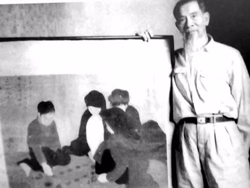 Họa sĩ Nguyễn Phan Chánh bên bức “Chơi ô ăn quan”
