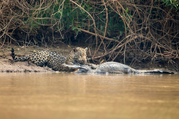 Trong đoạn video, báo đốm đã phục kích con cá sấu caiman, trên sông Three Brothers ở khu vực Pantanal thuộc bang Mato Grosso.