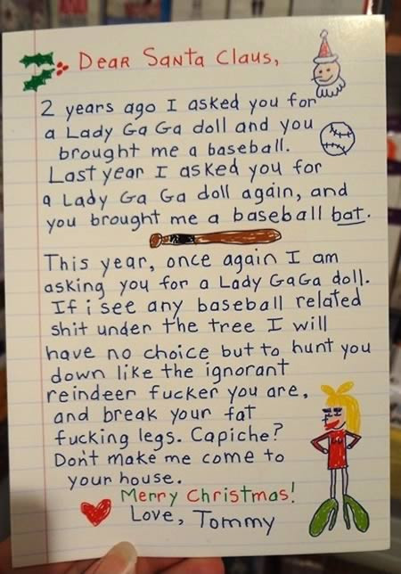 2 năm trước cháu xin ông tặng cho cháu một con búp bê Lady Gaga nhưng ông đã mang cho cháu một quả bóng chày. Năm ngoái cháu lại xin một con búp bê Lady Gaga và kết quả lại là một cây gậy bóng chày. Năm nay, một lần nữa, cháu xin ông hãy tặng cháu búp bê Lady Gaga. Nếu cháu lại thấy bất cứ thứ gì liên quan đến bóng chày ở dưới gốc cây thông Noel năm nay thì cháu sẽ săn bằng được ông và bẻ gãy mấy cái chân béo ú của ông. Ông đã hiểu chưa? Đừng có để cháu phải tìm đến nhà ông đấy.