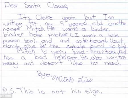 Cháu là Claire đây ạ. Nhưng mà lá thư này là cháu viết hộ em trai cháu – em Mitch. Em cháu muốn được ông tặng một cái đục lỗ gáy sách (Cháu cũng muốn một cái ạ) và một cái ván trượt tuyết (nhưng ông đừng tặng em ấy cái ván trượt nhé). Ông biết không, em Mitch rất tốt bụng nhưng mà lại rất nóng tính. Em ấy viết rất lộn xộn và không thích đọc sách ông ạ.
