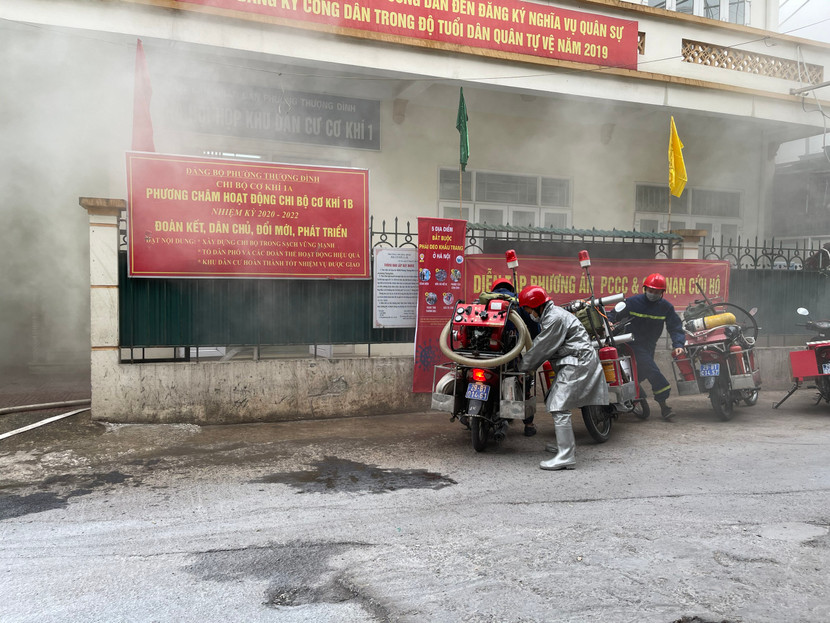 Theo phương án diễn tập, Nhà hội họp có tổng diện tích khoảng 50m2, nằm tại tầng 1 của khu nhà 3 tầng. Tình huống giả định vào khoảng 9h ngày 1-12, khi đang diễn ra tiệc cưới tại Nhà hội họp khu dân cư, do sơ ý của một bàn ăn lẩu, lúc thay cồn đã để lửa cháy ra bàn, rồi nhanh chóng lan sang các vật liệu xung quanh.