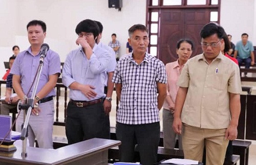 Cựu Chủ tịch xã Xuân Đỉnh Nguyễn Hữu Khiêm (ngoài cùng, bên phải) và các bị cáo liên quan.