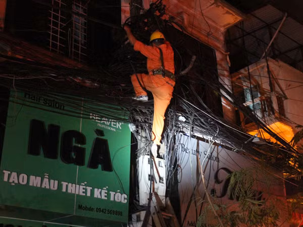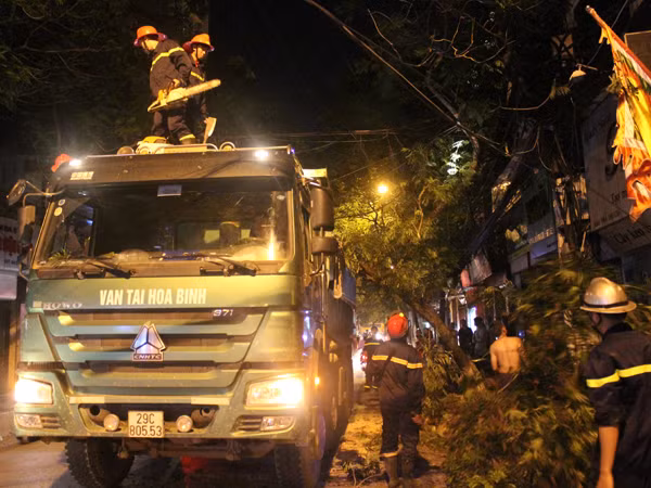 Nhân viên điện lực Ba Đình phối hợp cắt điện tránh gây cháy, nổ do sự cố cây đổ gây ra