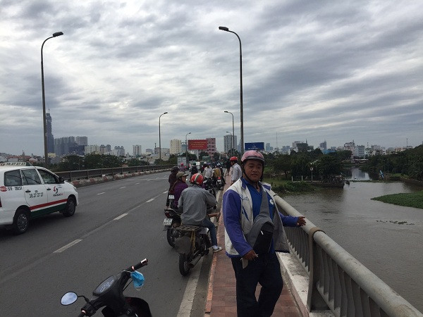 Nhiều người dân đang lưu thông dừng phương tiện trên cầu để theo dõi vụ việc khiến giao thông ùn ứ. Theo ghi nhận, đến 11h trưa cùng ngày, ca nô của lực lượng cứu hộ vẫn đang rảo quanh tìm nạn nhân mất tích.