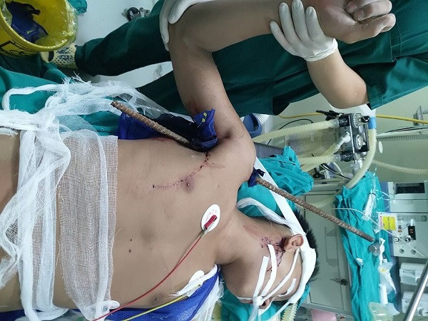 Các bác sĩ Bệnh viện Đa khoa Đức Giang vừa tiếp nhận bệnh nhân L.V.D (19 tuổi, ở Gia Lâm, Hà Nội) vào cấp cứu sau tai nạn bị thanh sắt đâm xuyên từ nách phải lên phía trước ngoài xương đòn phải, máu chảy rất nhiều.