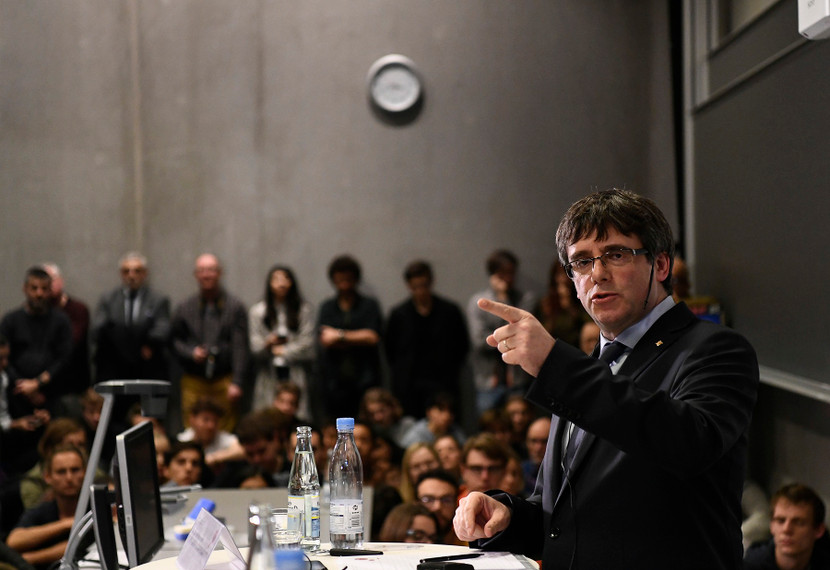 Ông Carles Puigdemont phát biểu tại buổi thảo luận về Catalonia tại Đại học Copenhagen, Đan Mạch