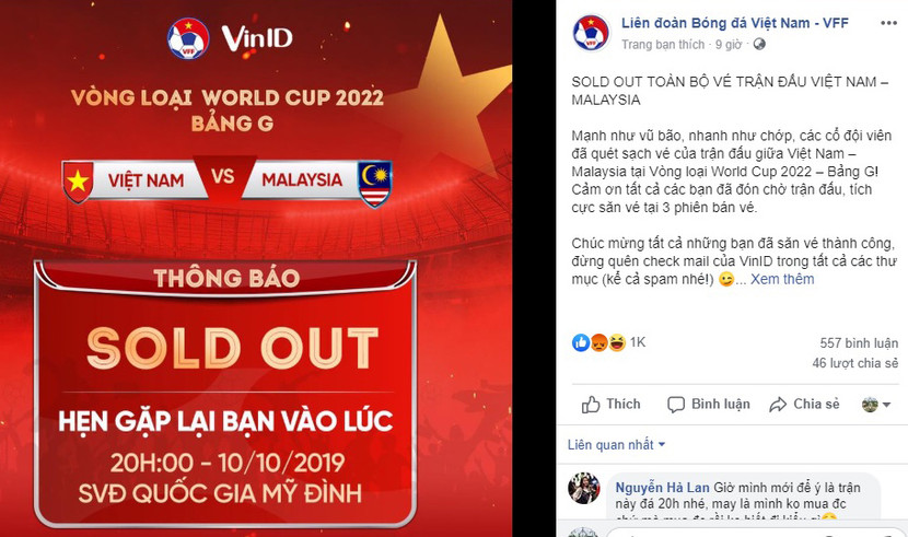 Hôm qua (19-9), VFF mở bán vé trận Việt Nam - Malaysia qua ứng dụng VinID vào 3 khung giờ 10h, 15h và 22h. Dự kiến việc bán vé duy trì tới ngày 23-9, song do nhu cầu mua lớn nên chỉ sau một ngày, vé đã được bán hết toàn bộ.