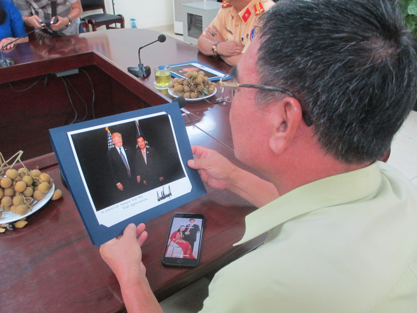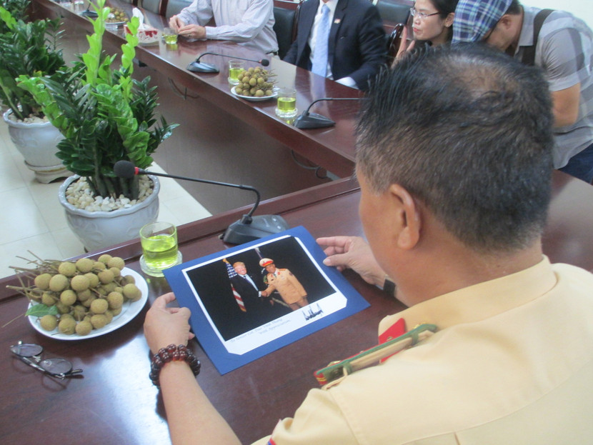 Đại tá Đào Vịnh Thắng xem bức hình ghi lại kỷ niệm trong chuyến công du Việt Nam của Tổng thống Mỹ Donald Trump