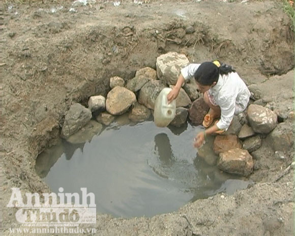 Mẹ ruột, chồng tử vong nghi do nhiễm độc nguồn nước, bây giờ chị Đinh Thị Lê lấy nước trong cái hố ngoài ruộng vừa được đào