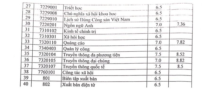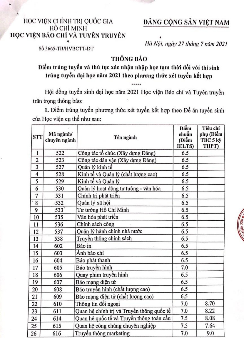 Học viện Báo chí và Truyền thông cũng đã đưa ra tiêu chí ngất ngưởng với điểm trúng tuyển vào ngành Truyền thông Marketing theo phương thức xét tuyển kết hợp là IELTS 7.0 và điểm trung bình 5 kỳ THPT là 9.0. Với ngành Truyền thông quốc tế, Học viện này lấy 7.5 IELTS và 8.5 điểm trung bình 5 học kỳ THPT. Ngành Truyền thông đại chúng cũng lấy 7.0 IELTS và 8.82 điểm trung bình 5 học kỳ THP.