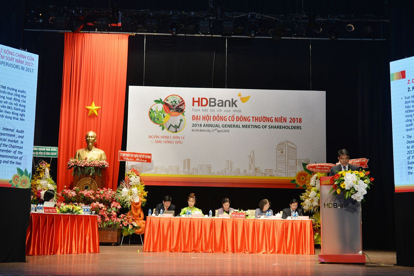 Ngày 21/4/2018, Đại hội đồng cổ đông (ĐHĐCĐ) thường niên năm 2017 của Ngân hàng TMCP Phát triển TPHCM (HDBank) diễn ra thành công với tỷ lệ cổ đông tham dự đạt 85,6%. Tất cả các nội dung Hội đồng quản trị HDBank trình tại Đại hội được thông qua với tỉ lệ cao.