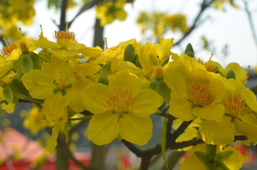 Vẻ đẹp của mai vàng đã được Phật Hoàng Trần Nhân Tông trân trọng ngợi ca trong bài thơ Tảo mai kỳ 1: “Năm cánh hoa tròn nhuỵ điểm vàng/ San hô vảy bạc vẻ tân trang/Cuối đông san sán cành khoe trắng/Một thoáng Xuân về đã rụng quang/ Móc ngọt chảy thơm tan giấc bướm/Trăng đêm loáng nước khát chim rừng/ Hằng Nga như biết hoa mai đẹp/Đâu tiếc cung Thiềm lạnh quế hương”.