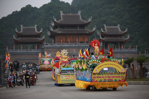 Đoàn xe hoa diễu hành chạy qua cổng Tam quan tiến vào khu quần thể chùa Tam Chúc