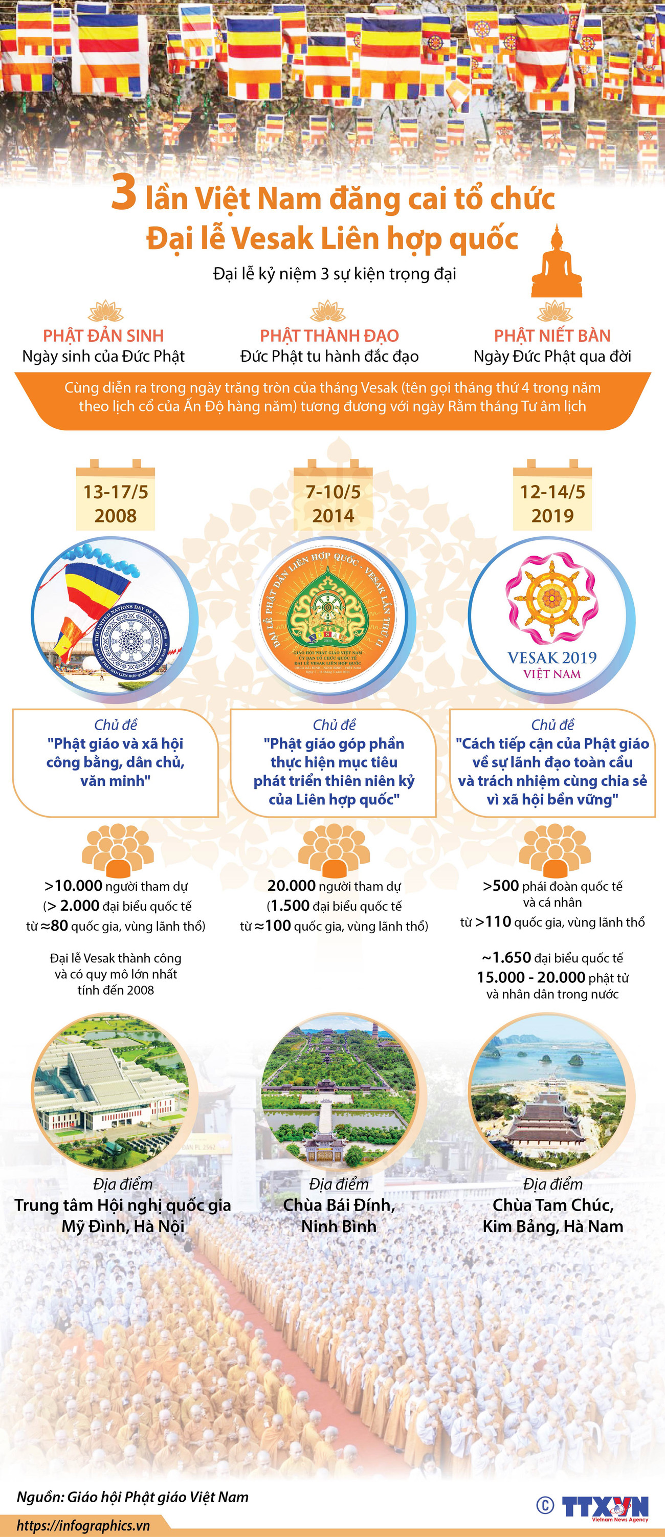 Đại lễ Vesak 2019 sẽ diễn ra từ ngày 12 đến 14-5, với chủ đề: “Cách tiếp cận của Phật giáo về sự lãnh đạo toàn cầu và trách nhiệm cùng chia sẻ vì xã hội bền vững”. Trong khuôn khổ của Đại lễ, bên cạnh các hội thảo, diễn đàn, còn có các nội dung văn hóa tâm linh như lễ tắm Phật truyền thống; thuyết pháp ý nghĩa Phật đản; triển lãm văn hóa Phật giáo; hội chợ văn hóa phẩm Phật giáo; khai đăng hoa sen; ra mắt mạng xã hội Phật giáo: Butta.vn; Lễ công bố ra mắt bộ tem chào mừng Đại lễ Vesak 2019; Đại lễ Hoa đăng cầu nguyện hòa bình thế giới…