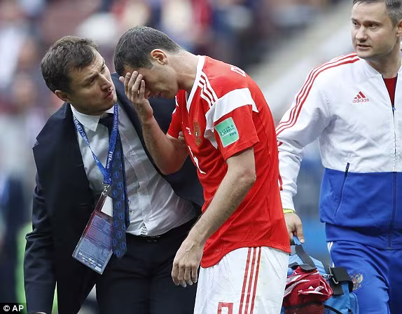 Không những thế, họ còn phải nhận bàn thua thứ 3. Phút 71, nhận đường tạt như đặt của Golovin bên cánh phải, cầu thủ mới vào sân thay người Dzyuba bật cao đánh đầu hiểm hóc, nâng cách biệt lên 3-0.