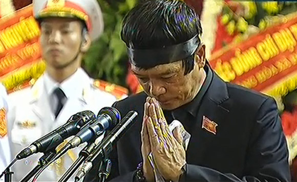 Nhà Tang lễ Quốc gia. 7 giờ! Đoàn Đại biểu Ban Chấp hành Trung ương Đảng Cộng sản Việt Nam do Tổng Bí thư Nguyễn Phú Trọng, dẫn đầu vào viếng. Tiếp theo là Đoàn đại biểu Quốc hội do Chủ tịch Quốc hội Nguyễn Sinh Hùng dẫn đầu vào viếng. Đoàn của Chủ tịch nước do Chủ tịch nước Trương Tấn Sang dẫn đầu, vào viếng. Đoàn của Ủy ban Trung ương Mặt trận Tổ quốc Việt Nam do đồng chí Nguyễn Thiện Nhân, Chủ tịch UBTƯ làm trưởng đoàn. Đoàn Quân ủy Trung ương do Đại tướng Phùng Quang Thanh, Phó Bí thư Quân ủy Trung ương làm trưởng đoàn.