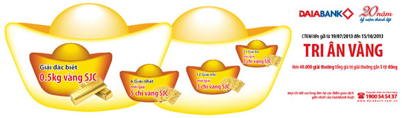 Trước đó, từ ngày 25/4 đến ngày 20/7/2013, DaiABank đã tổ chức chương trình khuyến mãi huy động “Mùa hè sôi động”. Dự kiến DaiABank sẽ tổ chức buổi quay số cuối chương trình vào cuối tháng 7 này để xác định giải Đặc biệt là xe Vespa LX150 3V i.e và sổ tiết kiệm 100 triệu đồng, tổng trị giá giải thưởng hơn 180,7 triệu đồng, cùng các giải Nhất, Nhì là các chuyến du lịch Hàn Quốc, Bali.
