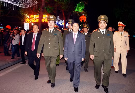 Đại tướng Trần Đại Quang và Chủ tịch UBND TP Nguyễn Thế Thảo kiểm tra, động viên lực lượng chức năng tại 1 điểm bắn pháo hoa ở hồ Hoàn Kiếm