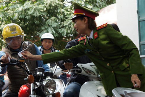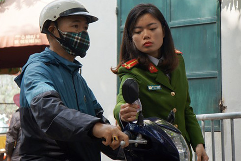 Nữ cánh sát quận Tây Hồ làm nhiệm vụ tại một điểm trông xe miễn phí gần Phủ Tây Hồ