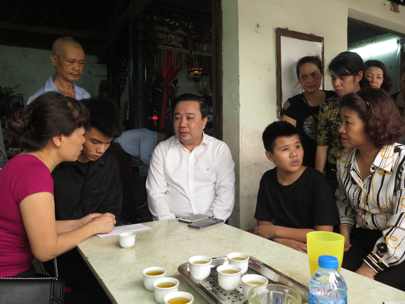 Giám đốc Sở Giáo dục và Đào tạo Hà Nội Chử Xuân Dũng đã trò chuyện, động viên hai con của chị Lê Thị Thu Hà là Trần Đức Anh (lớp 9A6) và Trần Đức Hiếu (lớp 6A9) - cùng là học sinh trường Trung học cơ sở Khương Thượng.