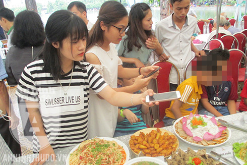 Các bạn trẻ tích cực chụp hình để ghi lại khoảnh khắc ấn tượng với bữa cỗ cưới thuần chay đầu tiên mà họ được tham dự